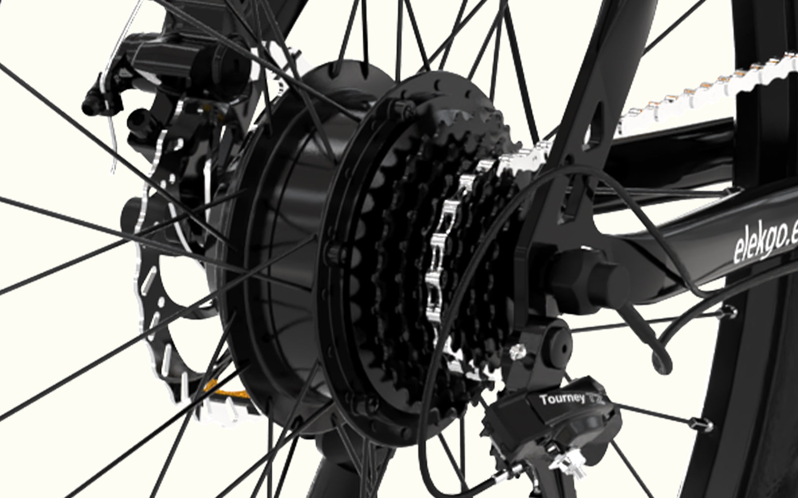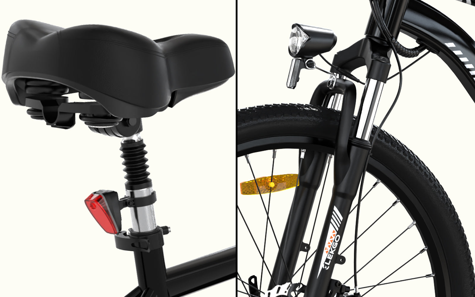 Le vélo électrique EG15 est livré avec un amortisseur de fourche et un amortisseur de siège fiables pour une sécurité accrue et une conduite plus fluide.